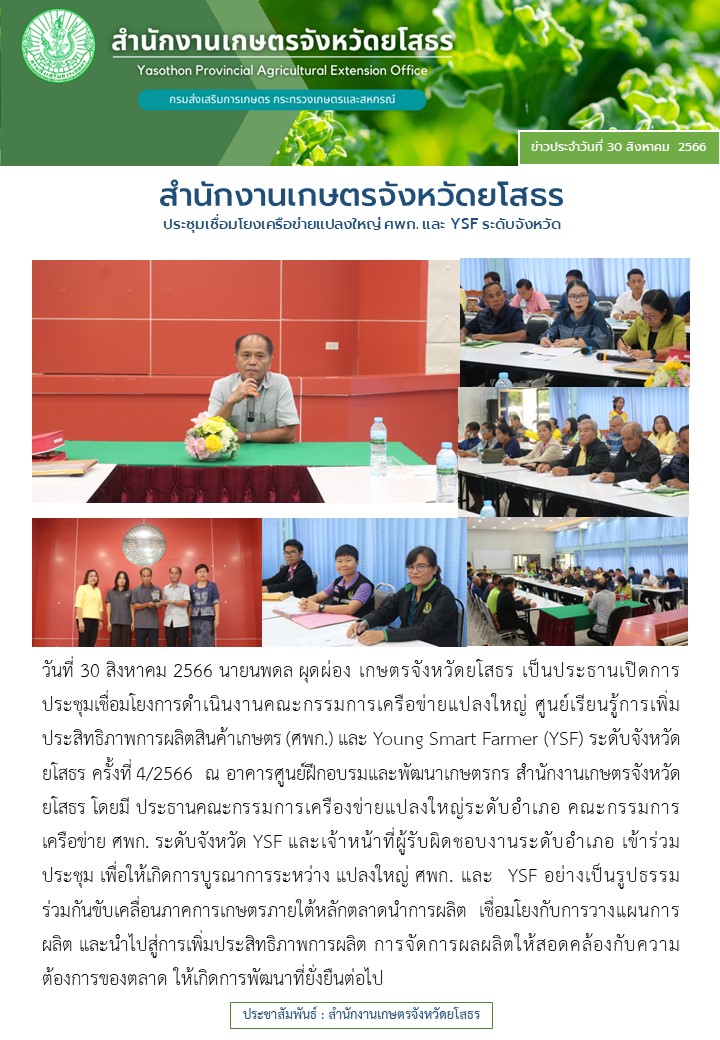 สำนักงานเกษตรจังหวัดยโสธร จัดประชุมเชื่อมโยงเครือข่ายแปลงใหญ่ ศพก. และ YSF