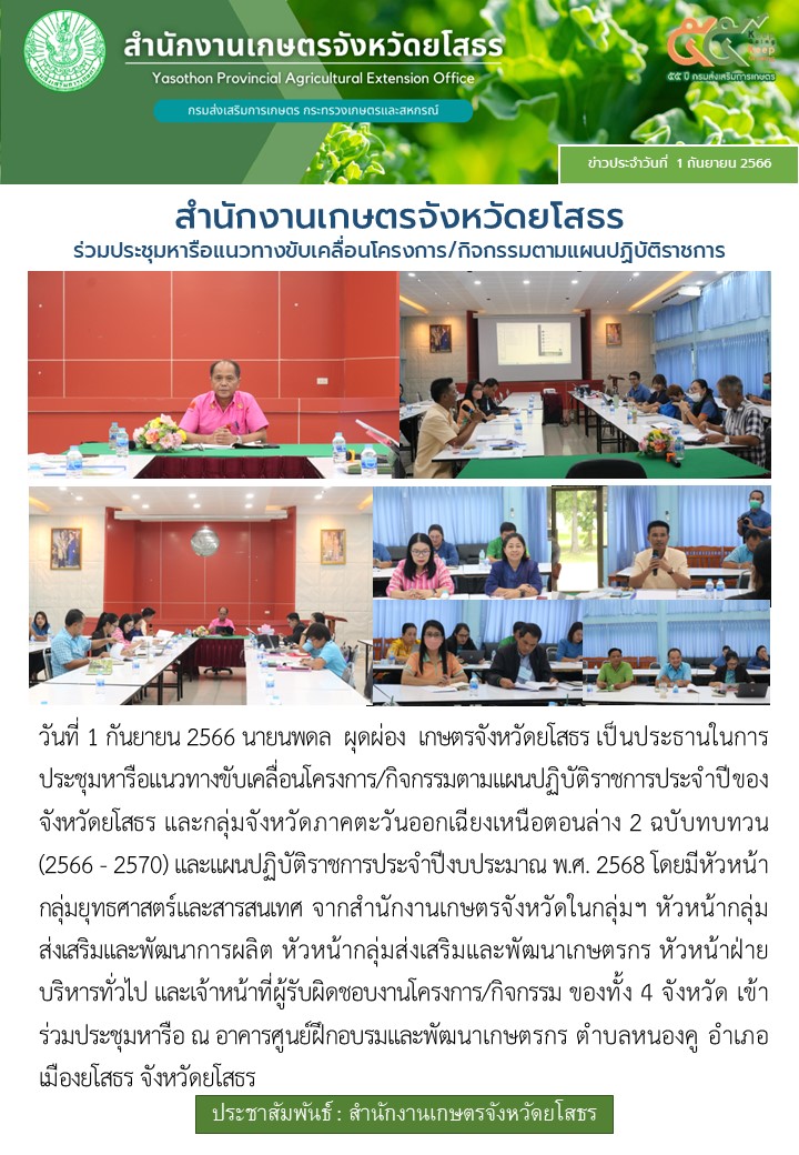 เกษตรจังหวัดยโสธร ร่วมประชุมหารือแนวทางขับเคลื่อนโครงการ/กิจกรรมตามแผนปฏิบัติราชการ