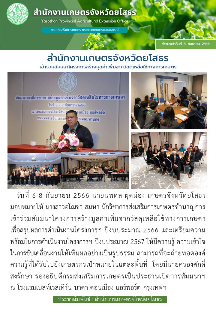 เกษตรจังหวัดยโสธร ร่วมสัมมนา โครงการสร้างมูลค่าเพิ่มจากวัสดุเหลือใช้ทางการเกษตร