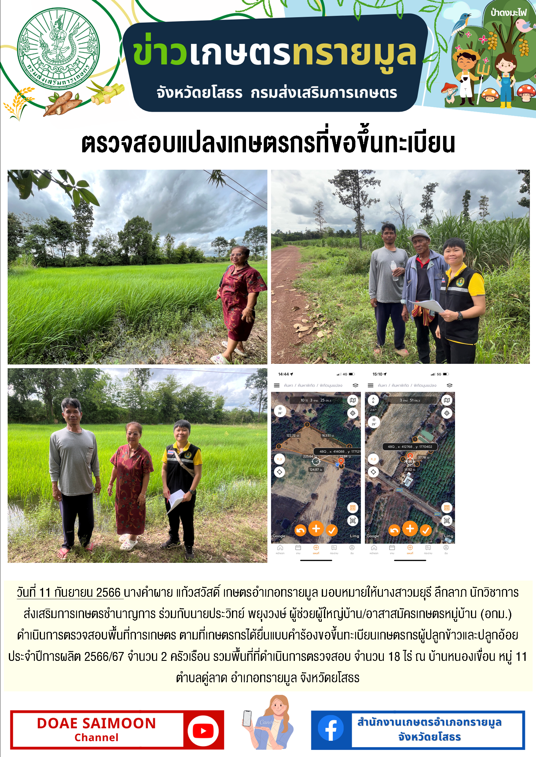 เกษตรอำเภอทรายมูล ตรวจสอบแปลงเกษตรกรที่ขอขึ้นทะเบียนเกษตรกร