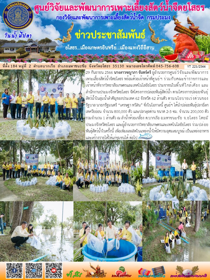 นางสาวชญาภา จันทร์ศรี ผู้อำนวยการศูนย์วิจัยและพัฒนาการเพาะเลี้ยงสัตว์น้ำจืดยโสธร พร้อมด้วยเจ้าหน้าที่ศูนย์ฯ จัดโครงการปล่อยพันธุ์สัตว์น้ำในลุ่มน้ำสำคัญของประเทศ 62 จังหวัด 62 ล้านตัว ตามนโยบายเร่งด่วนของรัฐบาล นายกรัฐมนตรี “เศรษฐา ทวีสิน”