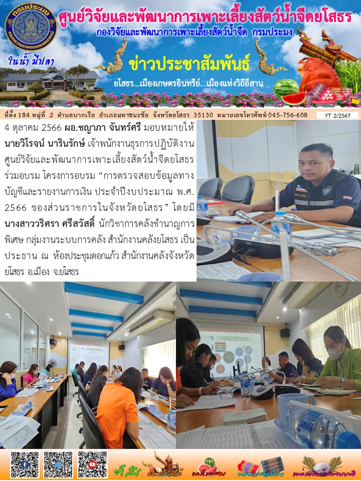 นายวิโรจน์ นารินรักษ์ เจ้าพนักงานธุรการปฏิบัติงาน ศูนย์วิจัยและพัฒนาการเพาะเลี้ยงสัตว์น้ำจืดยโสธร ร่วมอบรม โครงการอบรม “การตรวจสอบข้อมูลทางบัญชีและรายงานการเงิน ประจำปีงบประมาณ พ.ศ. 2566 ของส่วนราชการในจังหวัดยโสธร”