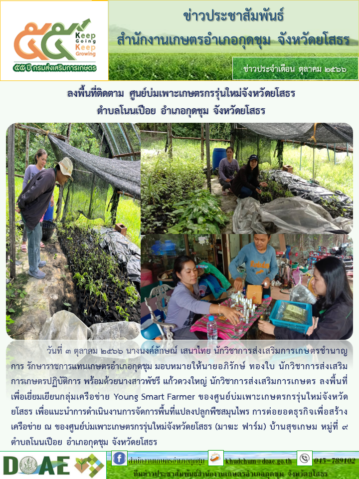 เกษตรอำเภอกุดชุม ลงพื้นที่ติดตาม ศูนย์บ่มเพาะเกษตรกรรุ่นใหม่จังหวัดยโสธร