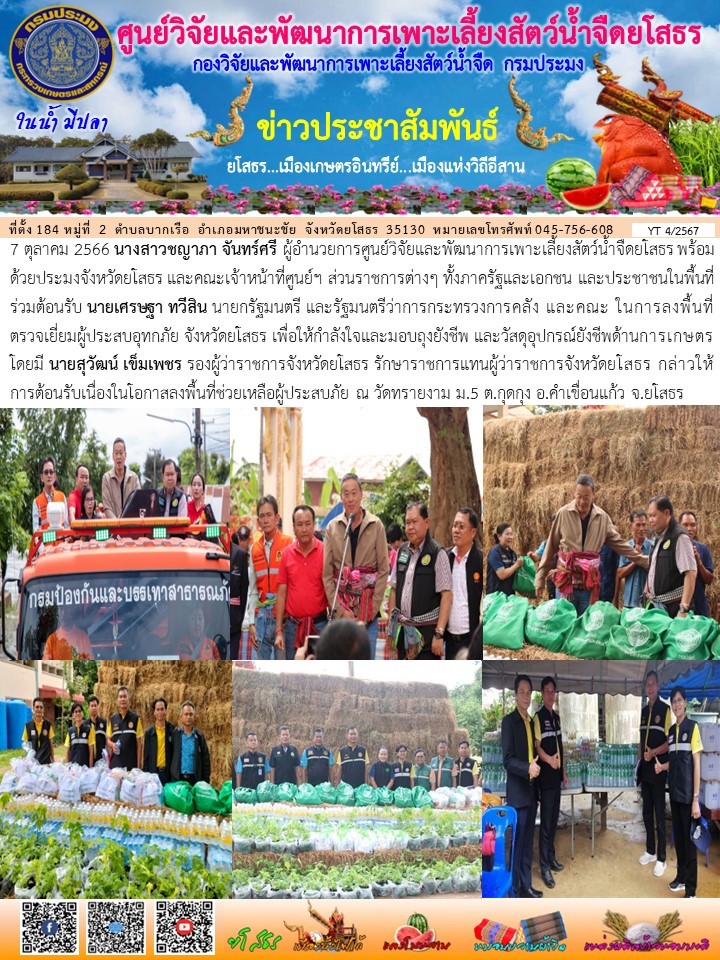 นางสาวชญาภา จันทร์ศรี ผู้อำนวยการศูนย์วิจัยและพัฒนาการเพาะเลี้ยงสัตว์น้ำจืดยโสธร พร้อมด้วยประมงจังหวัดยโสธร และคณะเจ้าหน้าที่ศูนย์ฯ ส่วนราชการต่างๆ ทั้งภาครัฐและเอกชน และประชาชนในพื้นที่ ร่วมต้อนรับ นายเศรษฐา ทวีสิน นายกรัฐมนตรี และคณะ