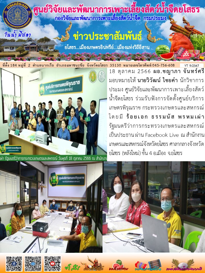 - [12:01] ทั่วไป เจ้าหน้าที่ศพจ.ยโสธร ร่วมกับปอ.คำเขื่อนแก้ว ลงพื้นที่ตรวจประเมินฟาร์มเกษตรกรที่ยื่นคำขอรับการรับรองตามมาตรฐานการปฏิบัติทางการเพาะเลี้ยงสัตว์น้ำที่ดีสำหรับฟาร์มเลี้ยงสัตว์น้ำเพื่อการบริโภค GAP มกษ. 7436-2563 ปลาตะเพียนขาว ในพื้นที่ อ.คำเขื่อนแก้ว