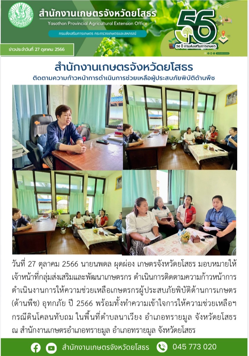 สำนักงานเกษตรจังหวัดยโสธร ติดตามความก้าวหน้าการให้ความช่วยเหลือผู้ประสบภัยพิบัติด้านพืช