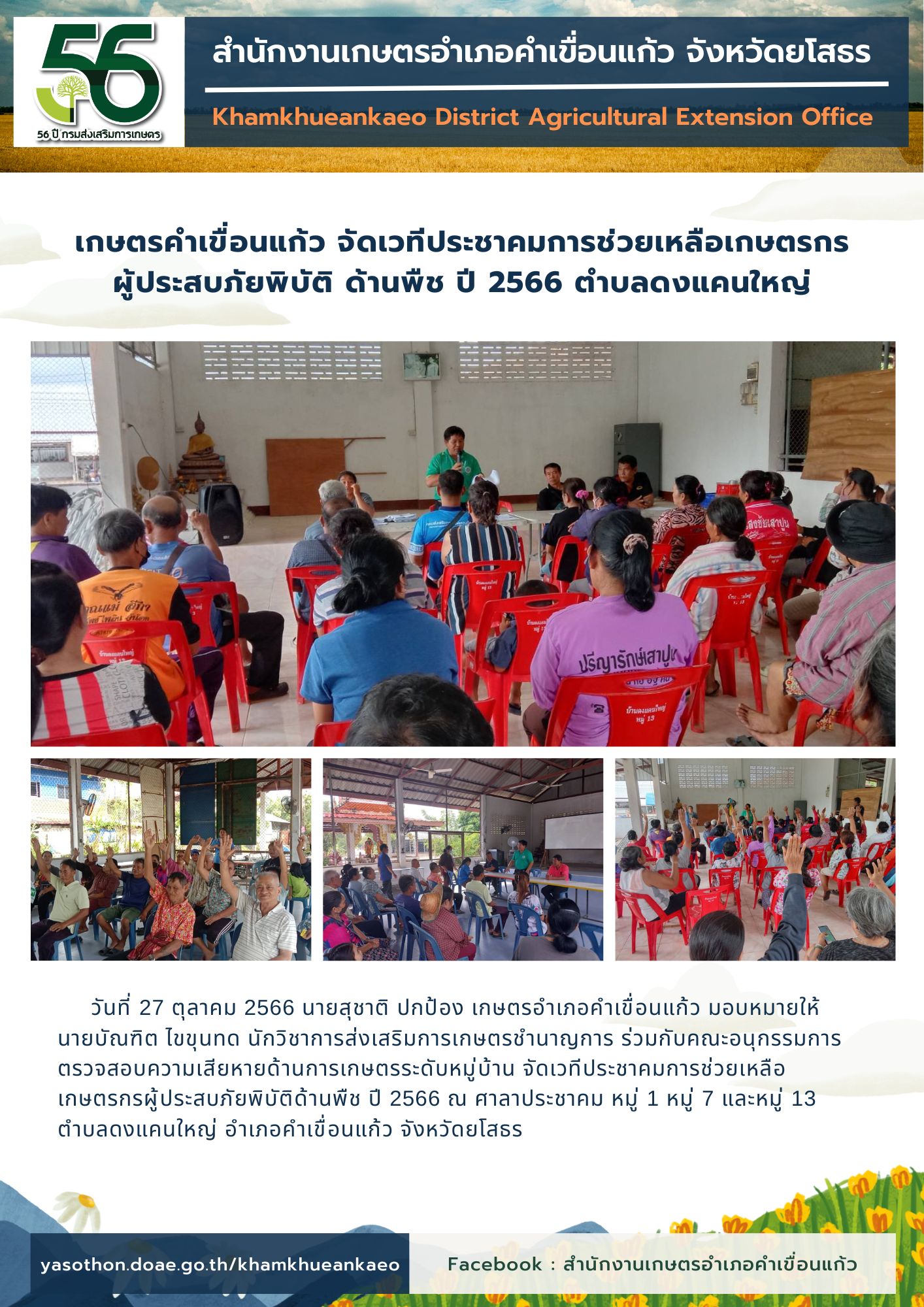 สำนักงานเกษตรอำเภอคำเขื่อนแก้ว จัดเวทีประชาคมช่วยเหลือผู้ประสบภัยพิบัติด้านพืช