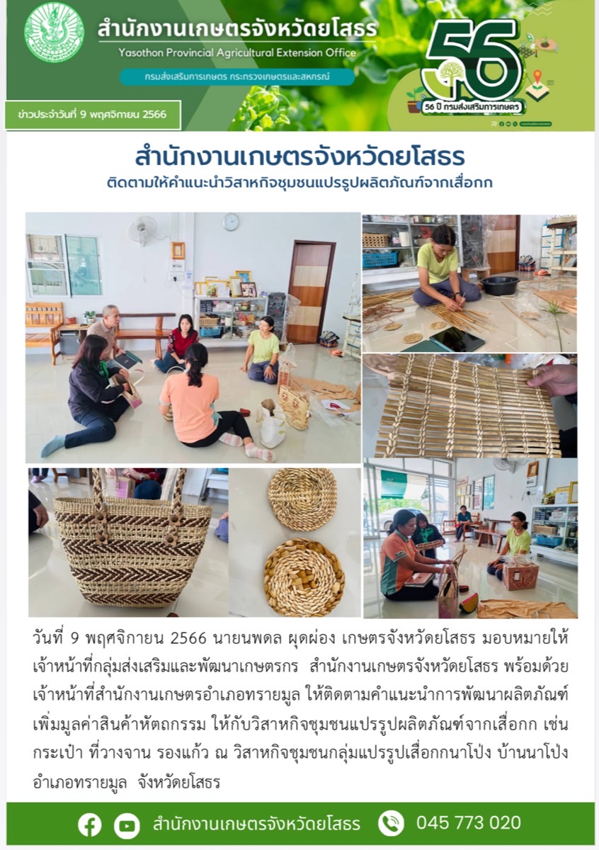 เกษตรจังหวัดยโสธร ติดตามให้คำแนะนำวิสาหกิจชุมชนแปรรูปผลิตภัณฑ์จากเสื่อกก
