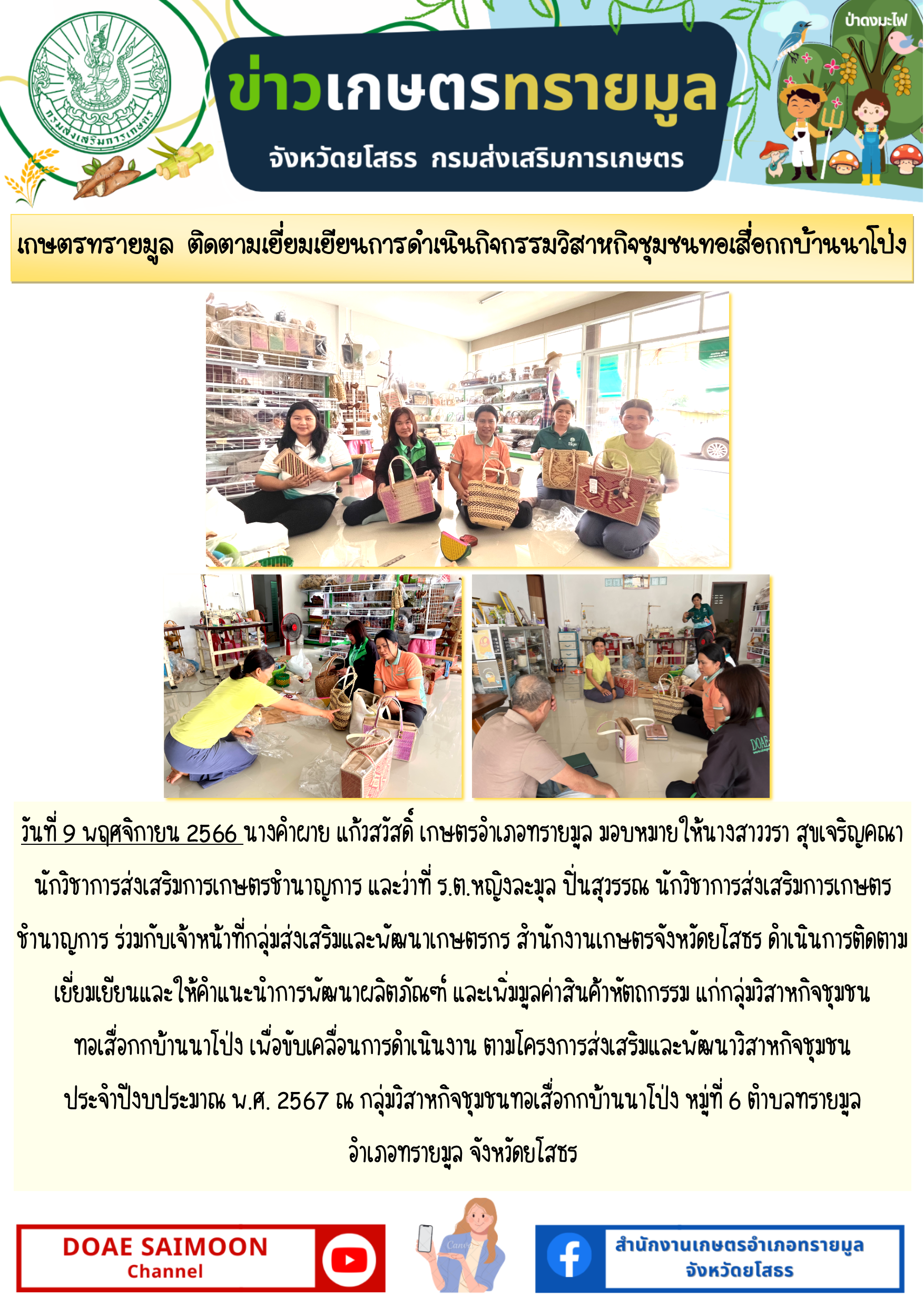 เกษตรอำเภอทรายมูล ติดตามเยี่ยมเยียนการดำเนินงานวิสาหกิจชุมชน