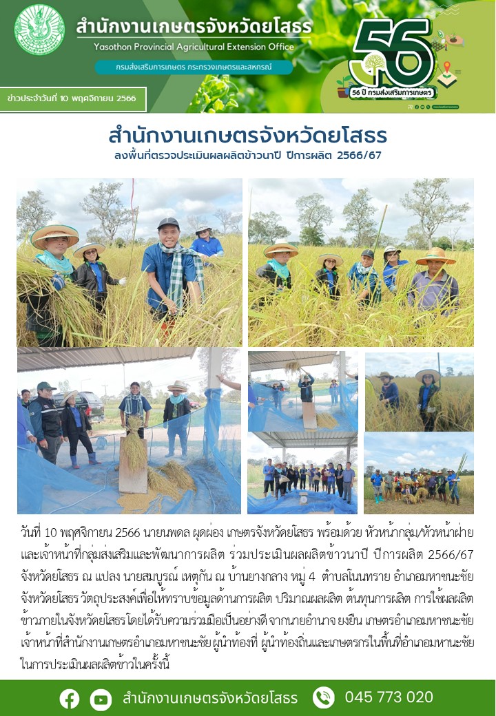 เกษตรจังหวัดยโสธร ลงพื้นที่ตรวจประเมินผลผลิตข้าวนาปี ปีการผลิต 2566/67
