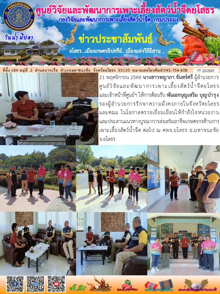 นางสาวชญาภา จันทร์ศรี ผู้อำนวยการศูนย์วิจัยและพัฒนาการเพาะเลี้ยงสัตว์น้ำจืดยโสธร และเจ้าหน้าที่ศูนย์ฯ ให้การต้อนรับ พันเอกบุญเสริม บุญบำรุง รองผู้อำนวยการรักษาความมั่งคงภายในจังหวัดยโสธร และคณะ