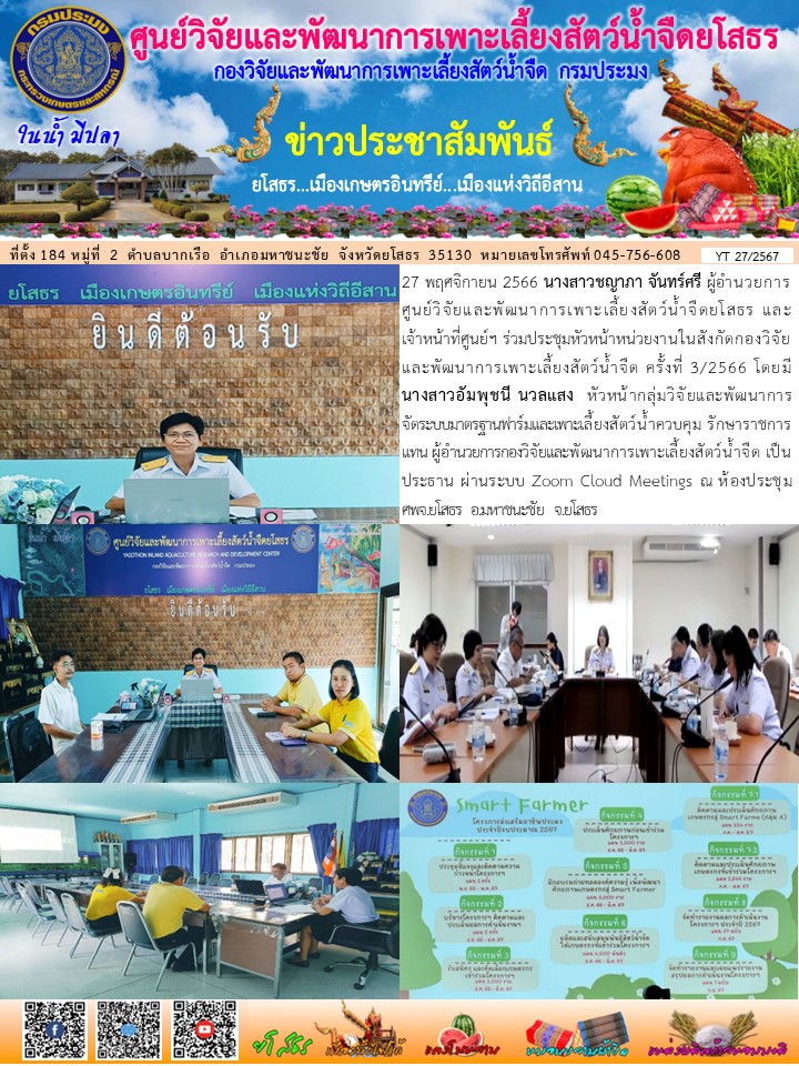 นางสาวชญาภา จันทร์ศรี ผู้อำนวยการศูนย์วิจัยและพัฒนาการเพาะเลี้ยงสัตว์น้ำจืดยโสธร และเจ้าหน้าที่ศูนย์ฯ ร่วมประชุมหัวหน้าหน่วยงานในสังกัดกองวิจัยและพัฒนาการเพาะเลี้ยงสัตว์น้ำจืด ครั้งที่ 3/2566