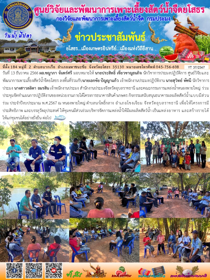 เจ้าหน้าที่ศูนย์วิจัยและพัฒนาการเพาะเลี้ยงสัตว์น้ำจืดยโสธร ลงพื้นที่ร่วมกับสำนักงานประมงจังหวัดอุบลราชธานี และคณะกรรมการแหล่งน้ำหนองพายใหญ่ ร่วมประชุมจัดทำแผนการปฏิบัติงานของหน่วยงานภายใต้โครงการธนาคารสินค้าเกษตร