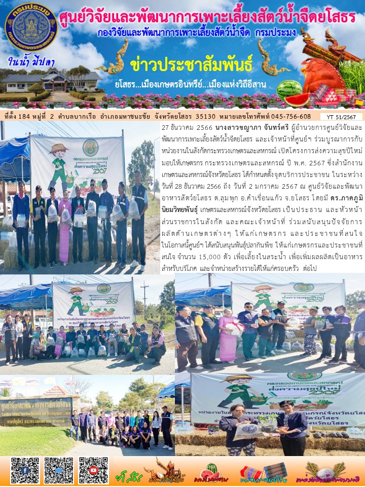 นางสาวชญาภา จันทร์ศรี ผู้อำนวยการศูนย์วิจัยและพัฒนาการเพาะเลี้ยงสัตว์น้ำจืดยโสธร และเจ้าหน้าที่ศูนย์ฯ ร่วมบูรณาการกับหน่วยงานในสังกัดกระทรวงเกษตรและสหกรณ์ เปิดโครงการส่งความสุขปีใหม่ มอบให้เกษตรกร กระทรวงเกษตรและสหกรณ์ ปี พ.ศ. 2567