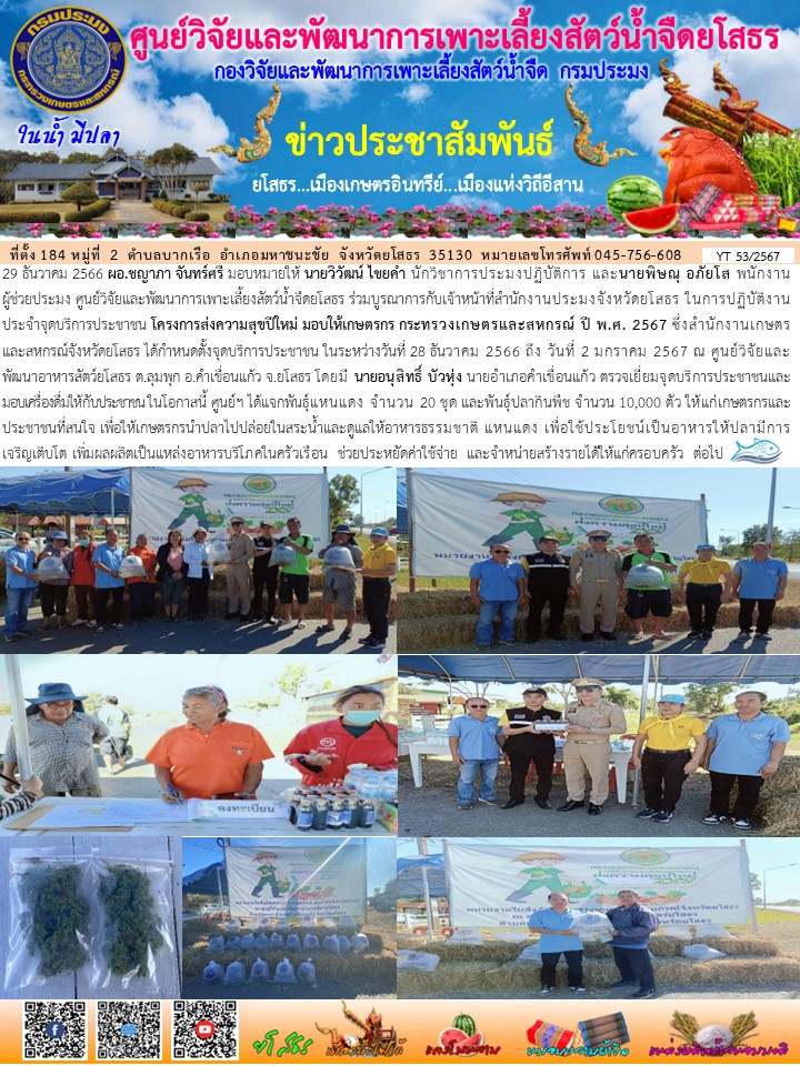 เจ้าหน้าที่ศูนย์วิจัยและพัฒนาการเพาะเลี้ยงสัตว์น้ำจืดยโสธร ร่วมบูรณาการกับเจ้าหน้าที่สำนักงานประมงจังหวัดยโสธร ในการปฏิบัติงานประจำจุดบริการประชาชน โครงการส่งความสุขปีใหม่ มอบให้เกษตรกร กระทรวงเกษตรและสหกรณ์ ปี พ.ศ. 2567