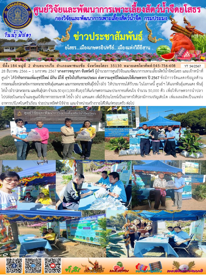 ผู้อำนวยการศูนย์วิจัยและพัฒนาการเพาะเลี้ยงสัตว์น้ำจืดยโสธร และเจ้าหน้าที่ศูนย์ฯ ได้จัดกิจกรรมเพิ่มสุขปีใหม่ มีกิน มีใช้ สุขใจไปกับกรมประมง ส่งความสุขปีใหม่มอบให้เกษตรกร ปี 2567