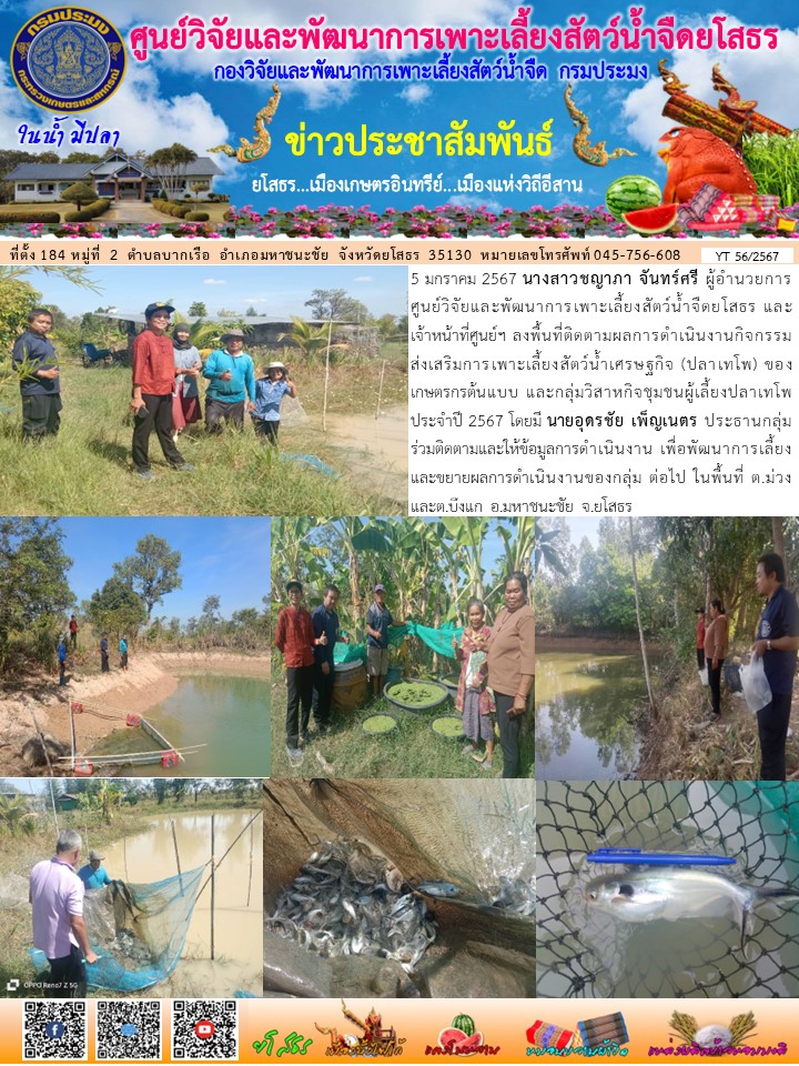 นางสาวชญาภา จันทร์ศรี ผอ.ศพจ.ยโสธร และเจ้าหน้าที่ศูนย์ฯ ลงพื้นที่ติดตามผลการดำเนินงานกิจกรรมส่งเสริมการเพาะเลี้ยงสัตว์น้ำเศรษฐกิจ (ปลาเทโพ) ของเกษตรกรต้นแบบ และกลุ่มวิสาหกิจชุมชนผู้เลี้ยงปลาเทโพ ประจำปี 2567