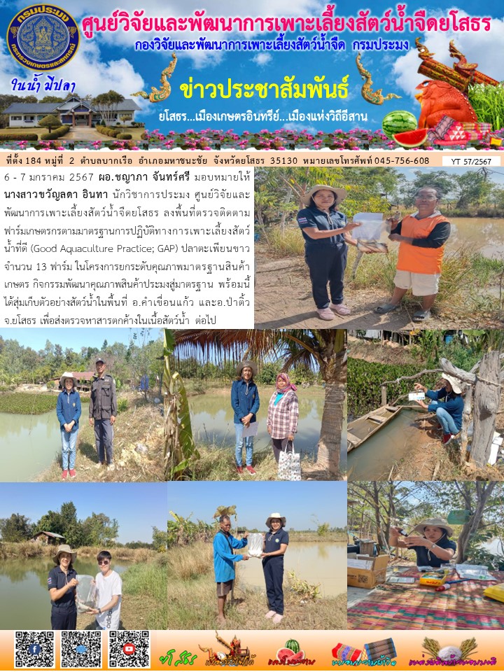 - [12:01] ทั่วไป เจ้าหน้าที่ศพจ.ยโสธร ร่วมกับปอ.คำเขื่อนแก้ว ลงพื้นที่ตรวจประเมินฟาร์มเกษตรกรที่ยื่นคำขอรับการรับรองตามมาตรฐานการปฏิบัติทางการเพาะเลี้ยงสัตว์น้ำที่ดีสำหรับฟาร์มเลี้ยงสัตว์น้ำเพื่อการบริโภค GAP มกษ. 7436-2563 ปลาตะเพียนขาว ในพื้นที่ อ.คำเขื่อนแก้ว