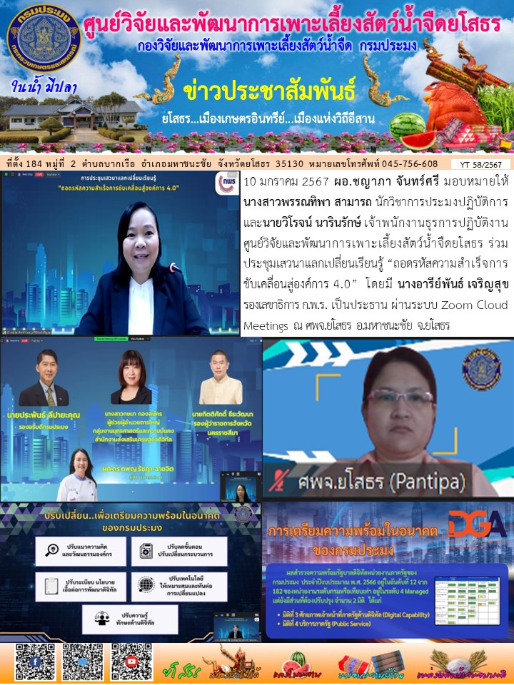 นางสาวพรรณทิพา สามารถ นักวิชาการประมงปฏิบัติการ และเจ้าหน้าที่ศพจ.ยโสธร ร่วมประชุมเสวนาแลกเปลี่ยนเรียนรู้ “ถอดรหัสความสำเร็จการขับเคลื่อนสู่องค์การ 4.0”