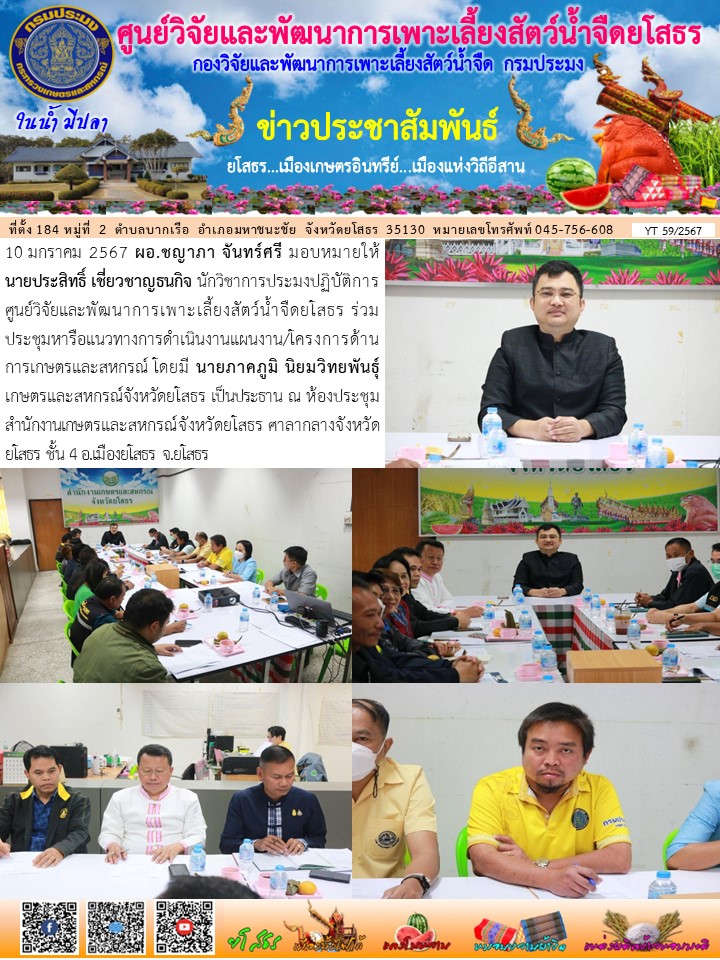 นายประสิทธิ์ เชี่ยวชาญธนกิจ นักวิชาการประมงปฏิบัติการ ศูนย์วิจัยและพัฒนาการเพาะเลี้ยงสัตว์น้ำจืดยโสธร ร่วมประชุมหารือแนวทางการดำเนินงานแผนงาน/โครงการด้านการเกษตรและสหกรณ์
