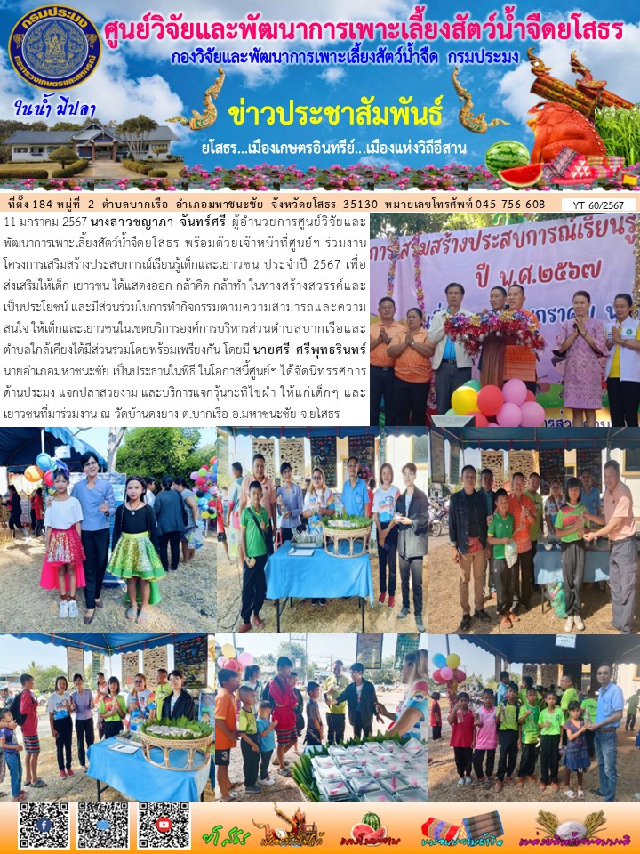 นางสาวชญาภา จันทร์ศรี ผู้อำนวยการศูนย์วิจัยและพัฒนาการเพาะเลี้ยงสัตว์น้ำจืดยโสธร พร้อมด้วยเจ้าหน้าที่ศูนย์ฯ ร่วมงานโครงการเสริมสร้างประสบการณ์เรียนรู้เด็กและเยาวชน ประจำปี 2567