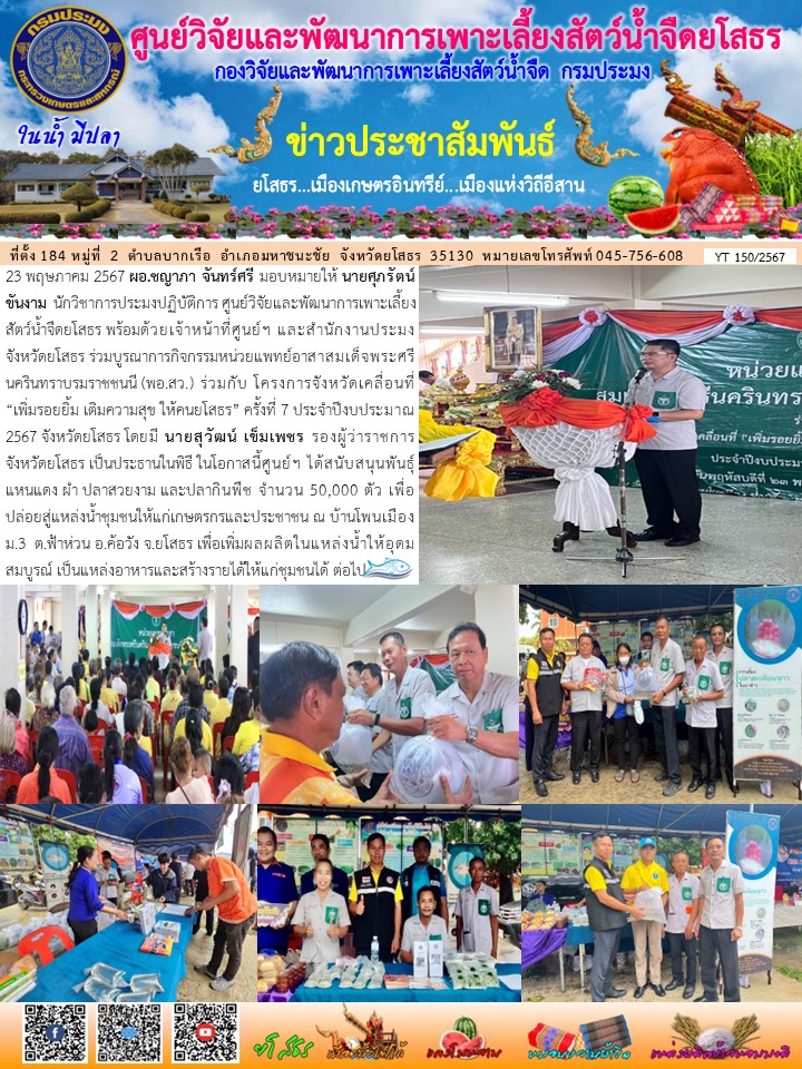 ศพจ.ยโสธร พร้อมด้วยเจ้าหน้าที่ศูนย์ฯ และสนง.ปจ.ยโสธร ร่วมบูรณาการกิจกรรมหน่วยแพทย์อาสาสมเด็จพระศรีนครินทราบรมราชชนนี (พอ.สว.) ร่วมกับ โครงการจังหวัดเคลื่อนที่ “เพิ่มรอยยิ้ม เติมความสุข ให้คนยโสธร” ครั้งที่ 7 ประจำปีงบประมาณ 2567 จังหวัดยโสธร