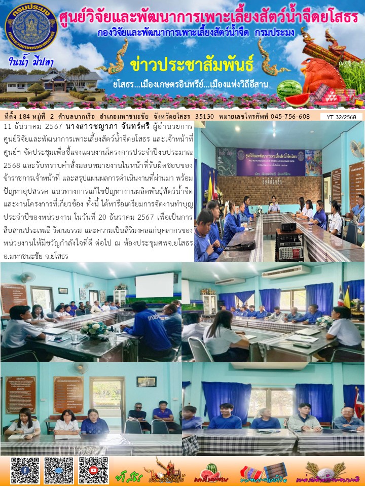 นางสาวชญาภา จันทร์ศรี ผู้อำนวยการศูนย์วิจัยและพัฒนาการเพาะเลี้ยงสัตว์น้ำจืดยโสธร และเจ้าหน้าที่ศูนย์ฯ จัดประชุมเพื่อชี้แจงแผนงานโครงการประจำปีงบประมาณ 2568 และรับทราบคำสั่งมอบหมายงานในหน้าที่รับผิดชอบของข้าราชการเจ้าหน้าที่ และสรุปแผนผลการดำเนินงาน