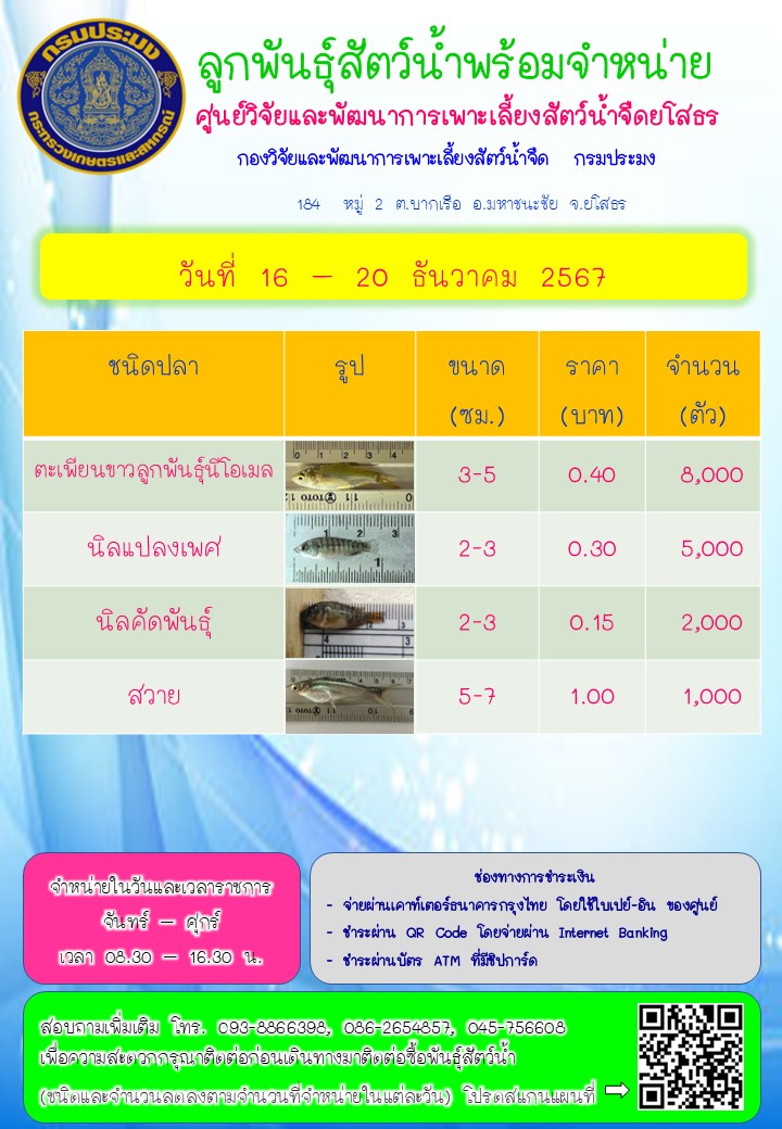 ลูกพันธุ์สัตว์น้ำพร้อมจำหน่าย 16 - 20 ธันวาคม 2567 ของศูนย์วิจัยและพัฒนาการเพาะเลี้ยงสัตว์น้ำจืดยโสธร