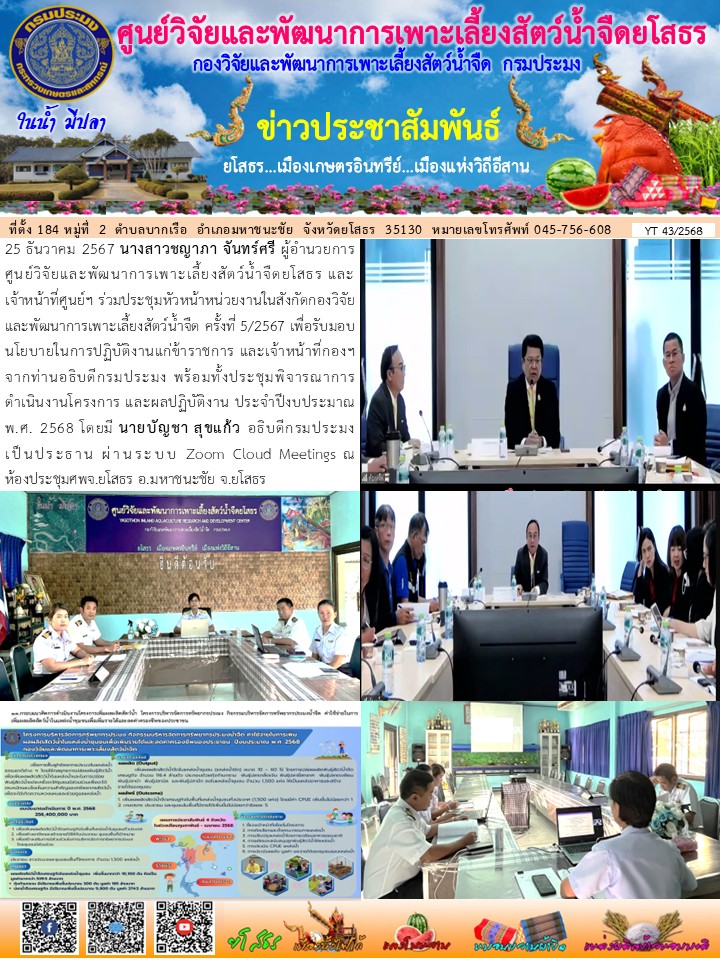 - [12:15] ทั่วไป นางสมพร โกศล ผู้อำนวยการศูนย์วิจัยและพัฒนาการเพาะเลี้ยงสัตว์น้ำจืดยโสธร และเจ้าหน้าที่ศูนย์ฯ ร่วมประชุมตรวจติดตามความก้าวหน้าผลการดำเนินงานตามแผนการตรวจราชการของผู้ตรวจราชการกระทรวงเกษตรและสหกรณ์ ประจำปีงบประมาณ พ.ศ. 2569 รอบที่ 1