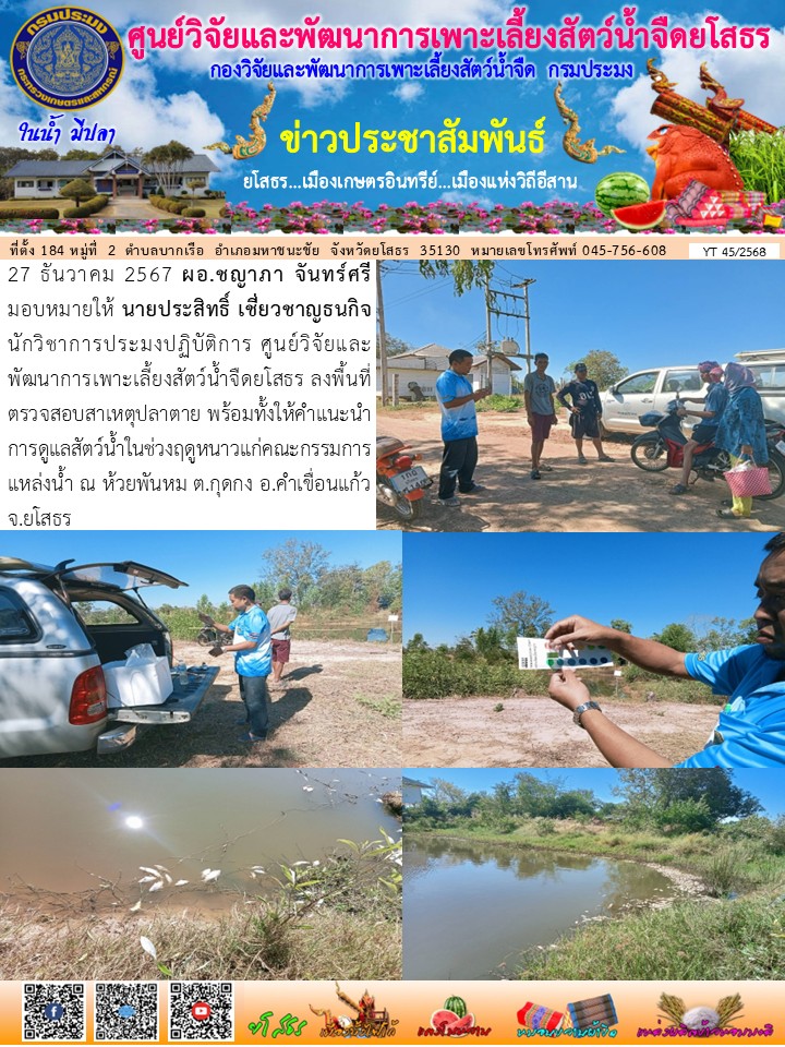 นายประสิทธิ์ เชี่ยวชาญธนกิจ นักวิชาการประมงปฏิบัติการ ศูนย์วิจัยและพัฒนาการเพาะเลี้ยงสัตว์น้ำจืดยโสธร ลงพื้นที่ตรวจสอบสาเหตุปลาตาย พร้อมทั้งให้คำแนะนำการดูแลสัตว์น้ำในช่วงฤดูหนาวแก่คณะกรรมการแหล่งน้ำ ณ ห้วยพันหม