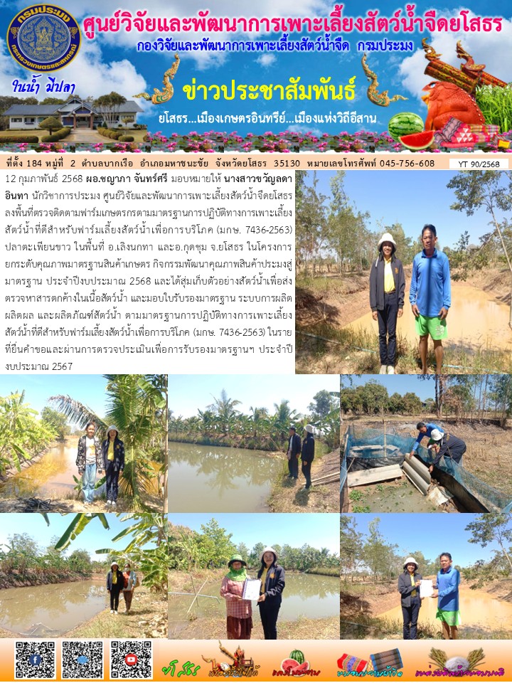 - [12:01] ทั่วไป เจ้าหน้าที่ศพจ.ยโสธร ร่วมกับปอ.คำเขื่อนแก้ว ลงพื้นที่ตรวจประเมินฟาร์มเกษตรกรที่ยื่นคำขอรับการรับรองตามมาตรฐานการปฏิบัติทางการเพาะเลี้ยงสัตว์น้ำที่ดีสำหรับฟาร์มเลี้ยงสัตว์น้ำเพื่อการบริโภค GAP มกษ. 7436-2563 ปลาตะเพียนขาว ในพื้นที่ อ.คำเขื่อนแก้ว