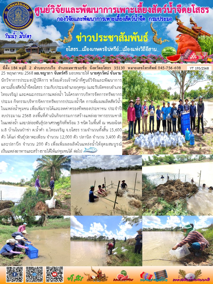 - [14:44] ทั่วไป เจ้าหน้าที่ศพจ.ยโสธรร่วมกับปอ.มหาชนะชัย และคณะกรรมการแหล่งน้ำ ในกิจกรรมบริหารจัดการทรัพยากรประมงน้ำจืด การเพิ่มผลผลิตสัตว์น้ำในแหล่งน้ำชุมชนฯ ประจำปีงบประมาณ 2569 ลงพื้นที่ปล่อยพันธุ์ปลาที่พร้อม 3 ชนิด ในพื้นที่ บึงพระเสาร์