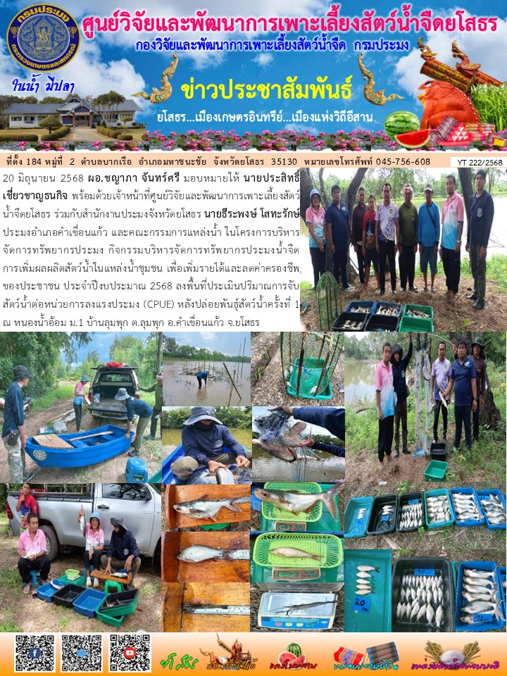- [14:44] ทั่วไป เจ้าหน้าที่ศพจ.ยโสธรร่วมกับปอ.มหาชนะชัย และคณะกรรมการแหล่งน้ำ ในกิจกรรมบริหารจัดการทรัพยากรประมงน้ำจืด การเพิ่มผลผลิตสัตว์น้ำในแหล่งน้ำชุมชนฯ ประจำปีงบประมาณ 2569 ลงพื้นที่ปล่อยพันธุ์ปลาที่พร้อม 3 ชนิด ในพื้นที่ บึงพระเสาร์