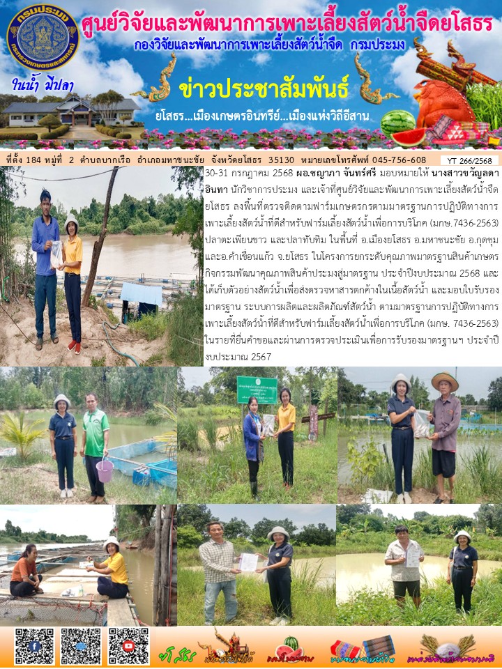 เจ้าที่ศพจ.ยโสธร ลงพื้นที่ตรวจติดตามฟาร์มเกษตรกรตามมาตรฐานการปฏิบัติทางการเพาะเลี้ยงสัตว์น้ำที่ดีสำหรับฟาร์มเลี้ยงสัตว์น้ำเพื่อการบริโภค (มกษ.7436-2563) ปลาตะเพียนขาว และปลาทับทิม และมอบใบรับรองมาตรฐานฯ ในรายที่ยื่นคำขอและผ่านมาตรฐานฯ