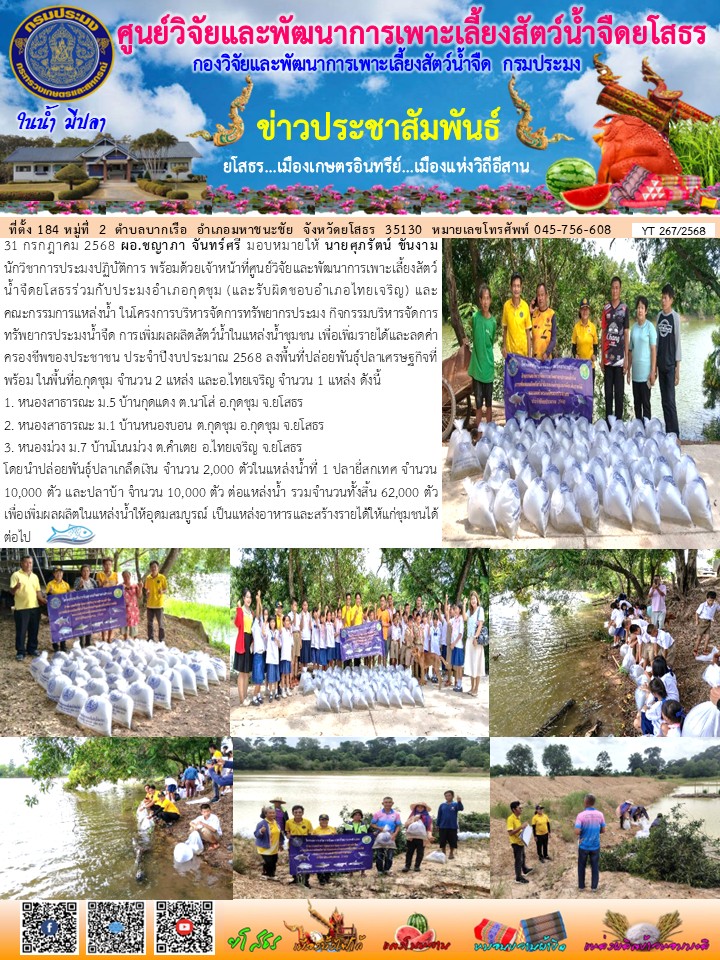 - [14:44] ทั่วไป เจ้าหน้าที่ศพจ.ยโสธรร่วมกับปอ.มหาชนะชัย และคณะกรรมการแหล่งน้ำ ในกิจกรรมบริหารจัดการทรัพยากรประมงน้ำจืด การเพิ่มผลผลิตสัตว์น้ำในแหล่งน้ำชุมชนฯ ประจำปีงบประมาณ 2569 ลงพื้นที่ปล่อยพันธุ์ปลาที่พร้อม 3 ชนิด ในพื้นที่ บึงพระเสาร์