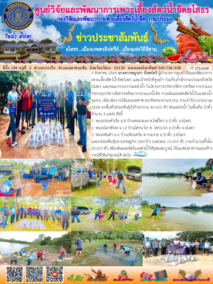 เจ้าหน้าที่ศพจ.ยโสธร ร่วมกับสนง.ปจ.ยโสธร และคณะกรรมการแหล่งน้ำ ในกิจกรรมบริหารจัดการทรัพยากรประมงน้ำจืด การเพิ่มผลผลิตสัตว์น้ำในแหล่งน้ำชุมชนฯ ลงพื้นที่ปล่อยพันธุ์กุ้งก้ามกราม และพันธุ์ปลาบ้า ในพื้นที่อ.ป่าติ้ว