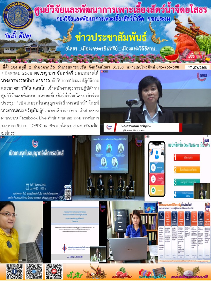 - [12:15] ทั่วไป นางสมพร โกศล ผู้อำนวยการศูนย์วิจัยและพัฒนาการเพาะเลี้ยงสัตว์น้ำจืดยโสธร และเจ้าหน้าที่ศูนย์ฯ ร่วมประชุมตรวจติดตามความก้าวหน้าผลการดำเนินงานตามแผนการตรวจราชการของผู้ตรวจราชการกระทรวงเกษตรและสหกรณ์ ประจำปีงบประมาณ พ.ศ. 2569 รอบที่ 1