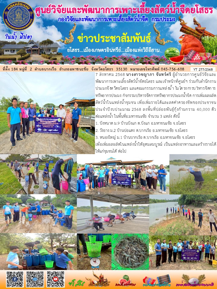 เจ้าหน้าที่ศพจ.ยโสธร ร่วมกับสนง.ปจ.ยโสธร และคณะกรรมการแหล่งน้ำ ในโครงการบริหารจัดการทรัพยากรประมง กิจกรรมบริหารจัดการทรัพยากรประมงน้ำจืด การเพิ่มผลผลิตสัตว์น้ำในแหล่งน้ำชุมชนฯ ลงพื้นที่ปล่อยพันธุ์กุ้งก้ามกราม ในพื้นที่อ.มหาชนะชัย จำนวน 3 แหล่ง