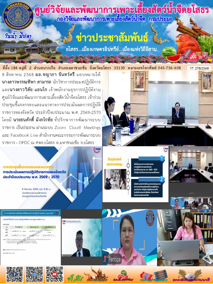 - [12:15] ทั่วไป นางสมพร โกศล ผู้อำนวยการศูนย์วิจัยและพัฒนาการเพาะเลี้ยงสัตว์น้ำจืดยโสธร และเจ้าหน้าที่ศูนย์ฯ ร่วมประชุมตรวจติดตามความก้าวหน้าผลการดำเนินงานตามแผนการตรวจราชการของผู้ตรวจราชการกระทรวงเกษตรและสหกรณ์ ประจำปีงบประมาณ พ.ศ. 2569 รอบที่ 1