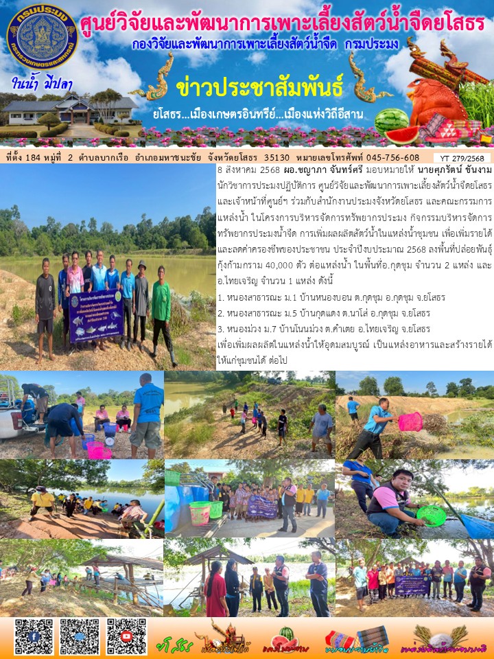เจ้าหน้าที่ศพจ.ยโสธร ร่วมกับสนง.ปจ.ยโสธร และคณะกรรมการแหล่งน้ำ ในโครงการบริหารจัดการทรัพยากรประมง กิจกรรมบริหารจัดการทรัพยากรประมงน้ำจืด การเพิ่มผลผลิตสัตว์น้ำในแหล่งน้ำชุมชนฯ ลงพื้นที่ปล่อยพันธุ์กุ้งก้ามกราม ในพื้นที่อ.กุดชุม และอ.ไทยเจริญ