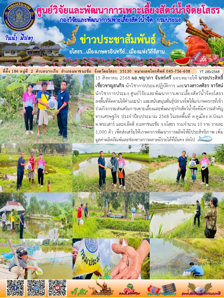 นายประสิทธิ์ เชี่ยวชาญธนกิจ นักวิชาการประมงปฏิบัติการ และเจ้าหน้าที่ศพจ.ยโสธร ลงพื้นที่ติดตามให้คำแนะนำ และสนับสนุนพันธุ์ปลาเทโพให้แก่เกษตรกรที่เข้าร่วมกิจกรรมส่งเสริมการเพาะเลี้ยงและพัฒนาธุรกิจสัตว์น้ำจืดที่มีความสำคัญทางเศรษฐกิจ