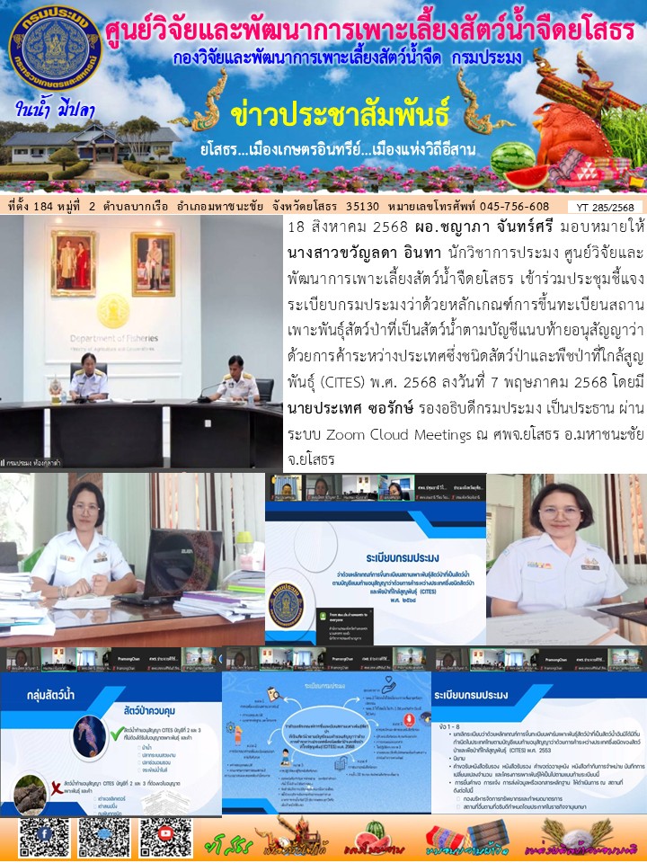 เจ้าหน้าที่ศพจ.ยโสธร เข้าร่วมประชุมชี้แจงระเบียบกรมประมงว่าด้วยหลักเกณฑ์การขึ้นทะเบียนสถานเพาะพันธุ์สัตว์ป่าที่เป็นสัตว์น้ำตามบัญชีแนบท้ายอนุสัญญาว่าด้วยการค้าระหว่างประเทศซึ่งชนิดสัตว์ป่าและพืชป่าที่ใกล้สูญพันธุ์(CITES) พ.ศ.2568 ลงวันที่ 7 พ.ค. 2568