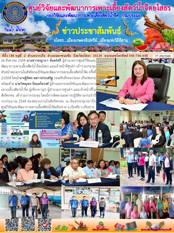 - [12:15] ทั่วไป นางสมพร โกศล ผู้อำนวยการศูนย์วิจัยและพัฒนาการเพาะเลี้ยงสัตว์น้ำจืดยโสธร และเจ้าหน้าที่ศูนย์ฯ ร่วมประชุมตรวจติดตามความก้าวหน้าผลการดำเนินงานตามแผนการตรวจราชการของผู้ตรวจราชการกระทรวงเกษตรและสหกรณ์ ประจำปีงบประมาณ พ.ศ. 2569 รอบที่ 1