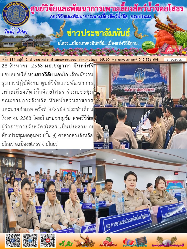 นางสาววิลัย แอนโก เจ้าพนักงานธุรการปฏิบัติงาน ศูนย์วิจัยและพัฒนาการเพาะเลี้ยงสัตว์น้ำจืดยโสธร ร่วมประชุมคณะกรมการจังหวัด หัวหน้าส่วนราชการ และนายอำเภอ ครั้งที่ 8/2568 ประจำเดือนสิงหาคม 2568