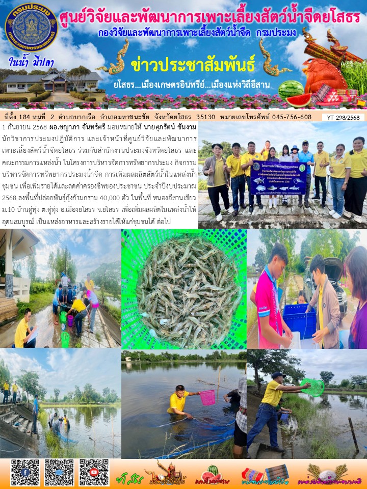 - [14:44] ทั่วไป เจ้าหน้าที่ศพจ.ยโสธรร่วมกับปอ.มหาชนะชัย และคณะกรรมการแหล่งน้ำ ในกิจกรรมบริหารจัดการทรัพยากรประมงน้ำจืด การเพิ่มผลผลิตสัตว์น้ำในแหล่งน้ำชุมชนฯ ประจำปีงบประมาณ 2569 ลงพื้นที่ปล่อยพันธุ์ปลาที่พร้อม 3 ชนิด ในพื้นที่ บึงพระเสาร์