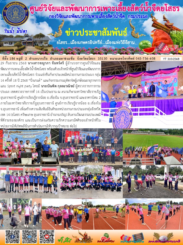 ผอ.ศพจ.ยโสธร พร้อมด้วยเจ้าหน้าที่ศูนย์ฯ ร่วมแข่งขันกีฬาประเพณีหน่วยงานกรมประมง กลุ่ม 14 ครั้งที่ 18 ปี 2568 “ปึ่งเกมส์” และกิจกรรมงานมุทิตาจิตผู้เกษียณอายุราชการและ Sport night party