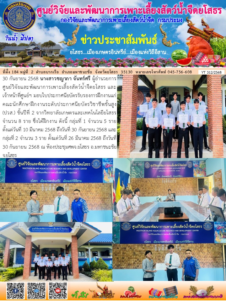 นางสาวชญาภา จันทร์ศรี ผู้อำนวยการศูนย์วิจัยและพัฒนาการเพาะเลี้ยงสัตว์น้ำจืดยโสธร และเจ้าหน้าที่ศูนย์ฯ มอบใบประกาศนียบัตรรับรองการฝึกงานแก่คณะนักศึกษาฝึกงานระดับประกาศนียบัตรวิชาชีพชั้นสูง (ปวส.) ชั้นปีที่ 2 จากวิทยาลัยเกษตรและเทคโนโลยียโสธร