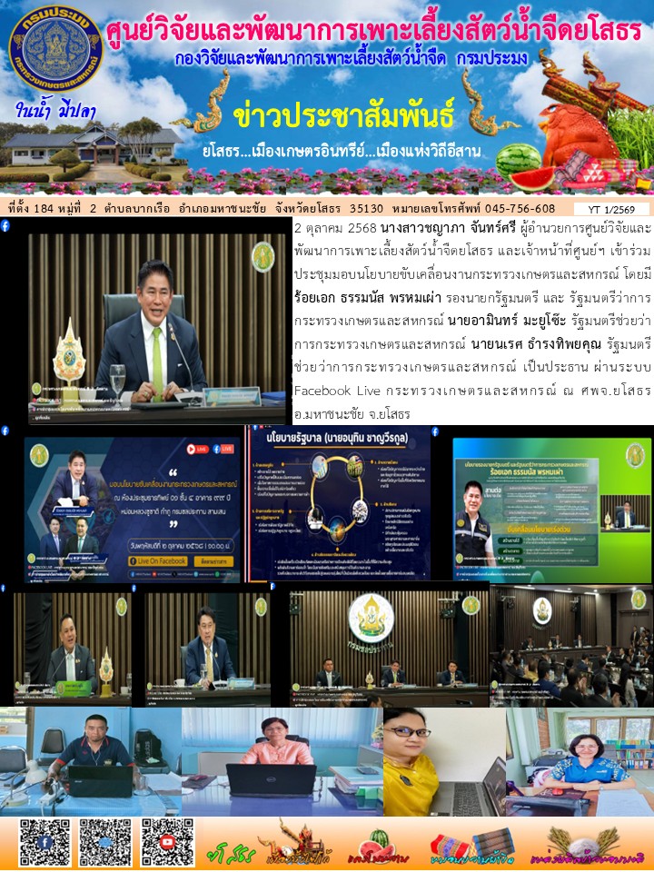 - [12:15] ทั่วไป นางสมพร โกศล ผู้อำนวยการศูนย์วิจัยและพัฒนาการเพาะเลี้ยงสัตว์น้ำจืดยโสธร และเจ้าหน้าที่ศูนย์ฯ ร่วมประชุมตรวจติดตามความก้าวหน้าผลการดำเนินงานตามแผนการตรวจราชการของผู้ตรวจราชการกระทรวงเกษตรและสหกรณ์ ประจำปีงบประมาณ พ.ศ. 2569 รอบที่ 1