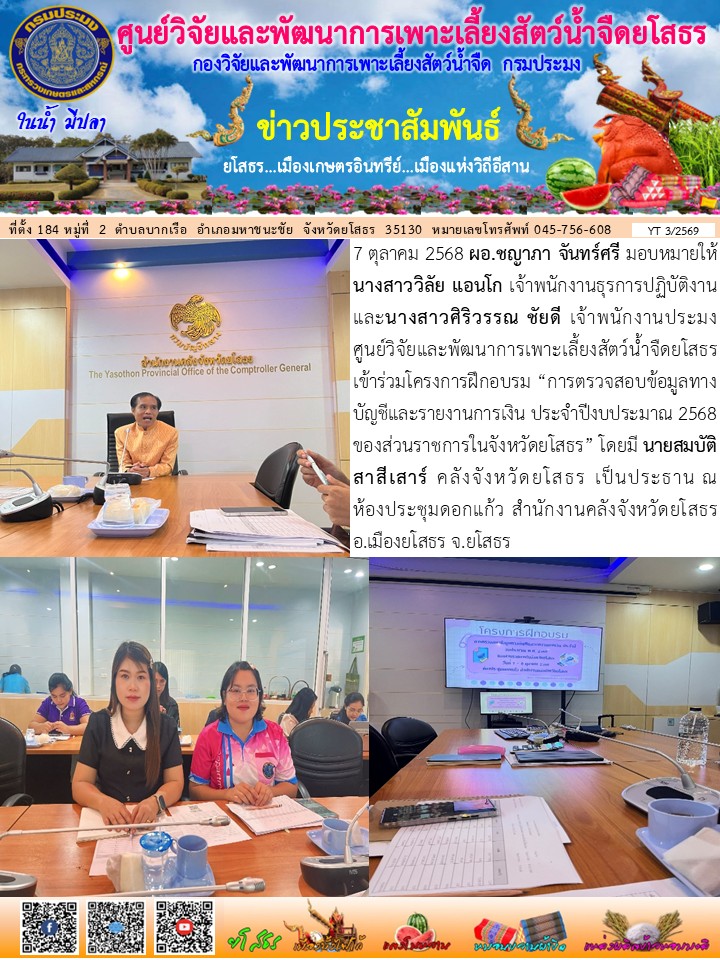 นางสาววิลัย แอนโก เจ้าพนักงานธุรการปฏิบัติงาน และนางสาวศิริวรรณ ชัยดี เจ้าพนักงานประมง ศูนย์วิจัยและพัฒนาการเพาะเลี้ยงสัตว์น้ำจืดยโสธร เข้าร่วมโครงการฝึกอบรม “การตรวจสอบข้อมูลทางบัญชีและรายงานการเงิน ประจำปีงบประมาณ 2568 ของส่วนราชการในจังหวัดยโสธร”