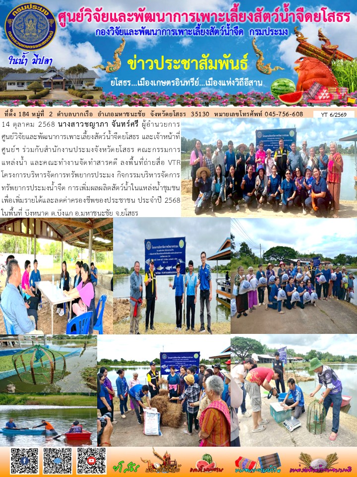 - [14:44] ทั่วไป เจ้าหน้าที่ศพจ.ยโสธรร่วมกับปอ.มหาชนะชัย และคณะกรรมการแหล่งน้ำ ในกิจกรรมบริหารจัดการทรัพยากรประมงน้ำจืด การเพิ่มผลผลิตสัตว์น้ำในแหล่งน้ำชุมชนฯ ประจำปีงบประมาณ 2569 ลงพื้นที่ปล่อยพันธุ์ปลาที่พร้อม 3 ชนิด ในพื้นที่ บึงพระเสาร์